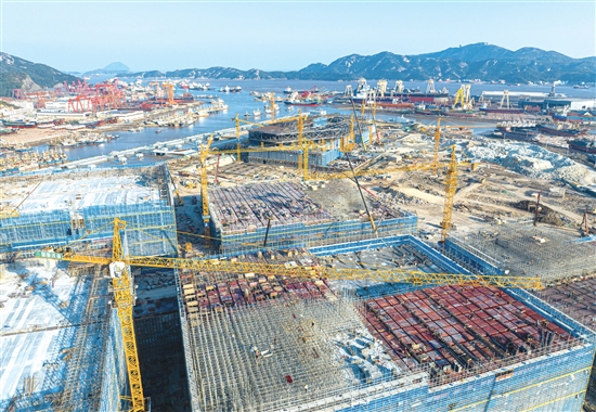 1月3日,松门镇礁山渔港小镇核心区改造工程现场,呈现一派热火朝天的建设场景。
