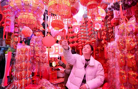 1月5日,太平街道东安路一家日用百货店内,市民正在挑选大红灯笼。随着春节的临近,太平街道传统年货市场日渐火热,灯笼、红辣椒串、春联等年货进入销售旺季。各商家备足货源,迎接年货销售高峰。