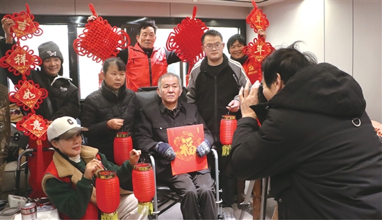 春节拍全家福是中华民族的一个传统习俗。为让老年群体度过一个难忘幸福年,1月16日起,箬横镇“青鸽·银龄”摄影志愿小队与巾帼社工、党员志愿者以上门的方式,为当地上百名有需要的老年人公益拍摄全家福,并送上米油、中国结、春联等年货。图为志愿者为贯庄村老人拍摄全家福。