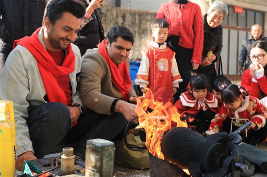 两位外籍友人名叫Sohaib Asif(中文名宋海泊)和Fazal Hadi(中文名哈扎尔),他们于去年夏天来到新河镇,是台州市肿瘤医院博士后工作站的高科技人才。当天恰逢新河老街集市,当地村妇和新河中心幼儿园的孩子们陪着两位外籍友人去老街赶集,领略原汁原味的中国传统年味。