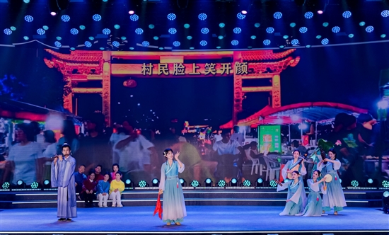 当晚的舞台上,派驻在温岭市大溪镇方山村的文化特派员谢法标登台演出,和新河镇人口文化艺术团的6位演员一起演绎他入驻方山村后,帮助村民们变荷花塘为“聚宝塘”的故事。