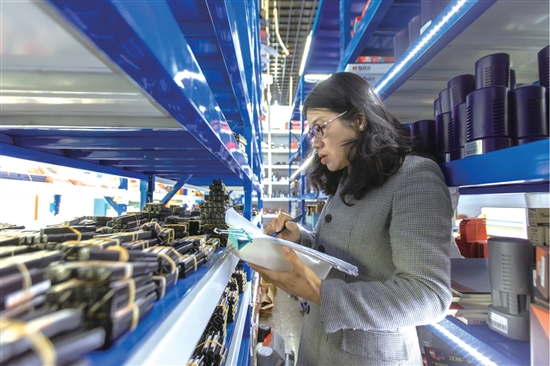 柯菊平正在店铺内清点刀具的数量和品类。(记者 徐伟杰 摄)