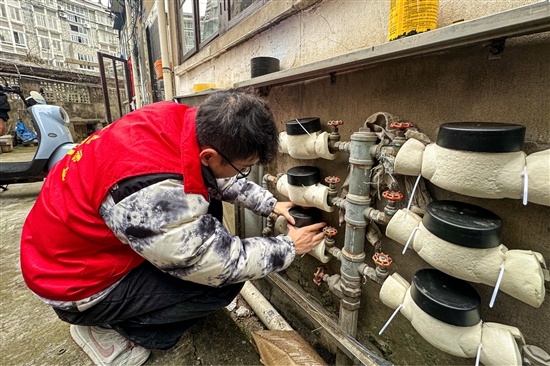 2月7日,在太平街道各小区内,市供水有限公司工作人员正有序地为易受冻害影响的水表包裹保温套。