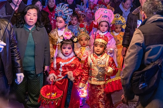 2月12日,在石塘镇里箬村,装扮成我国历史、神话、传说经典人物的小朋友们,在国家级非遗代表性项目大奏鼓的伴奏中,走街串巷巡游,为当地的老百姓送上新春祝福。老百姓纷纷出街,接受这份祝福,双向奔赴闹元宵,绘就新春佳节的圆满图景。