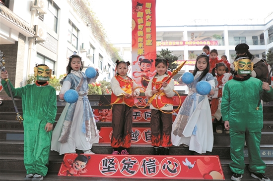 2月13日一大早,横湖小学校长陈海军领着“小哪吒”“小敖丙”以及“结界兽”在校门口迎接学生入校。校门口的台阶上贴上了“打破偏见”“坚定信心”“超越自我”“携手同行”“永不言弃”的“哪吒五大精神”,寓意同学们拾级而上,收取学校对大家的美好寄语。