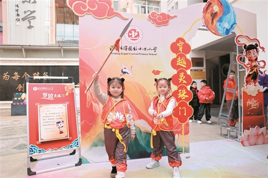 现场结合哪吒元素,涵盖穿越灵珠门、击鼓迎新春、许愿莲花池、哪吒来闹海、投掷乾坤圈等环节,热闹非凡。不少学生身穿红色传统服饰或装扮成哪吒进入校园,迎接新学期的到来。