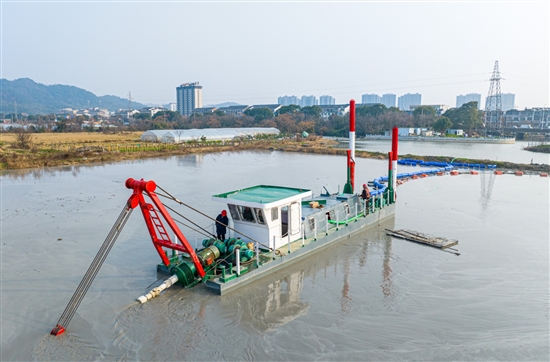 2月24日,在城北街道新开河内,清淤船上的工作人员正熟练地操作设备,将河底的淤泥吸入船舱,并通过管道输送到指定的堆放场地。