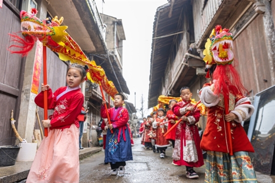 新河镇中心幼儿园的学生们则穿着传统汉服,排着队行,舞起了两条长长的中华龙。孩子们从原本清静的寺前桥老街“游龙”而过,立即引起了周边居民的关注。大家拿起手机,跟着小小的舞龙队,一起汇集到寺前桥头。