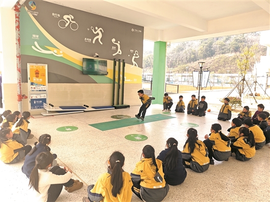 九龙小学神童门校区引入AI体感游戏系统,孩子们在进行跑步、跳远、仰卧起坐等运动时,智能设备都能实时监测数据。今年,学校还新增了各类地面游戏、墙面游戏,丰富孩子们的课间生活。