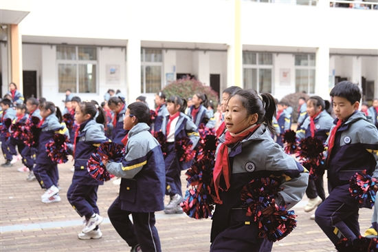 课间活动时,城西小学的孩子们跳起了啦啦操。