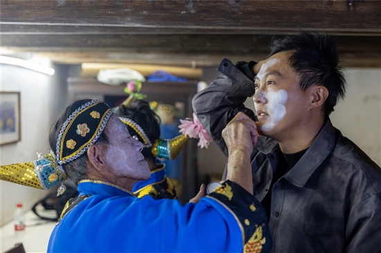大奏鼓国家级非遗传承人为陈文杰化上大奏鼓独有的红腮白面。