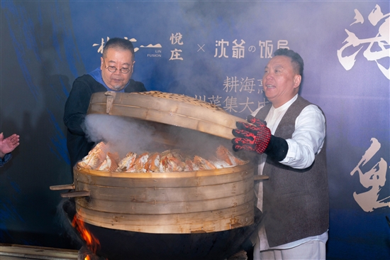 沈宏非和林美均一起为巨笼蒸海鲜盛宴揭笼。
