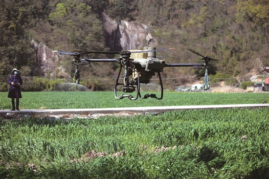 近日,城南镇冷水塘村,农户抢抓晴好天气,操作无人机在麦田里喷洒雾化药液,对麦穗期病虫害进行防治。