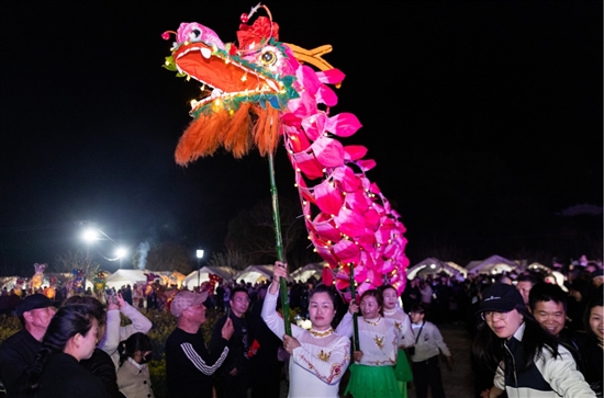 现场,熊熊篝火腾空而起,在初春微凉的夜色里点燃第一簇沸腾的温度。二十余个身着民族服装的青年,用足尖叩击大地,不断向人群发出共舞的邀约。村民蒋龙标被这份热情感染,欣然加入。