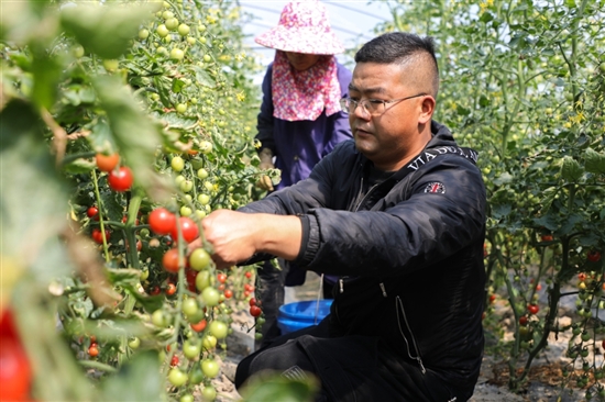 眼下,春风拂面,田间地头绿意盎然。在泽国肖健康果蔬园,70多亩的小番茄迎来了丰收季。肖文铎穿梭在钢架大棚间,仔细检查植株长势。