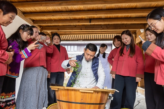3月28日,在温峤镇峨嵋山村,茶文化爱好者沉浸式体验采茶、制茶、品茶全流程,在劳动实践中传承非遗技艺,体悟茶文化魅力。
