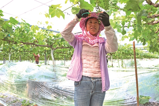 3月27日,在箬横镇津岭农科的“阳光玫瑰”葡萄种植基地内,一片热闹景象,20多名来自云南昆明的果蔬植保技术女工正在忙着疏果作业。
