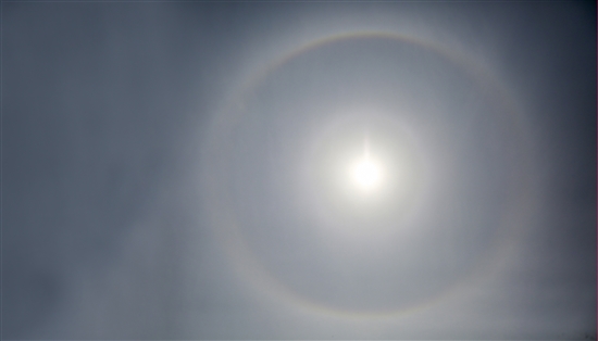 4月9日上午,我市上空出现日晕景象,巨大的七彩光圈将眩目的太阳围绕在中央,宛如给太阳戴上了一条彩色的项链。民间流传着“日晕三更雨,月晕午时风”的俗语,意味着日晕是天气变化的一种预兆,这与当天的天气预报吻合。