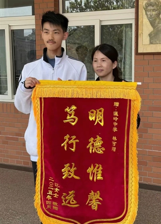 本报讯(记者江潇扬)4月3日,市民江女士手持锦旗来到温岭中学,感谢该校高三(5)班学生林可熠拾金不昧的善举。