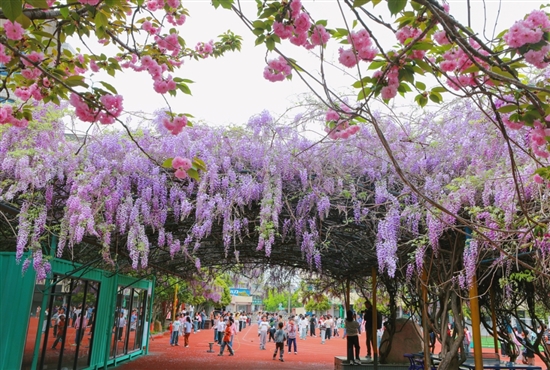 眼下,城东百丈小学岩下校区操场的一角,缠绕在廊架上的紫藤花开了。弯曲遒劲的藤蔓舒展着筋骨,垂落一串串葡萄似的花穗。边上的晚樱也开得正艳,红色的花朵在一片紫色中点缀着,非常好看。