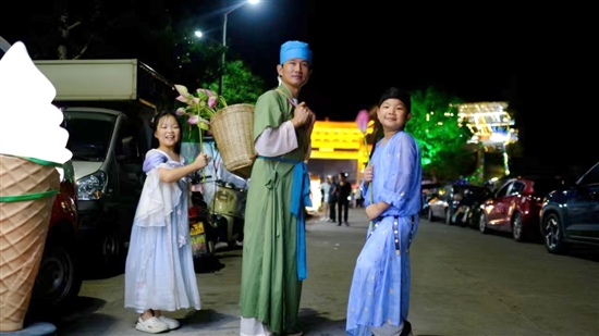 谢法标(中)穿上汉服,为方山村荷塘夜市拍摄短视频。