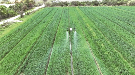 随着一阵嗡鸣,无人机机翼带起微风,小麦翻滚出层层绿色麦浪。飞手熟练操作着,混合后的药剂被均匀喷洒到麦田中。农户的种植规模较大,一般都会采用植保无人机进行防治,一天之内,一架飞机最多可以给1000多亩小麦喷洒药剂。