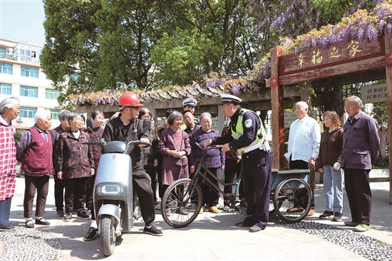 4月11日,箬横镇贯庄村文化长廊里,老年人齐聚,大家围着电动自行车和人力三轮车,认真聆听当地交警讲授的交通安全实操课。箬横镇现有老年人3.8万人。市公安局交通警察大队箬横中队启动“春季护航‘银发’出行安全”巡回宣传活动,4月份以来已覆盖近万人次。