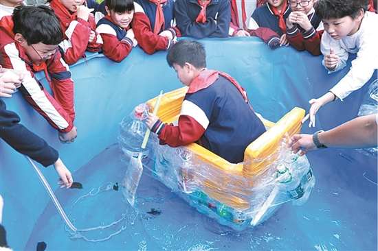 高年级同学则被前沿科技表演深深吸引。四足机器人灵动起舞,憨态可掬;“魔法大师” 带来的干冰秀,瞬间制造出云雾缭绕的 “人间仙境”;神奇水瓶摇一摇便变幻色彩,空气炮发射出肉眼可见的烟圈,每一个实验都令人大开眼界。五年级同学更是发挥创意,用泡沫箱和矿泉水瓶制作出能载人的小船,充分展现出创新思维与实践能力。