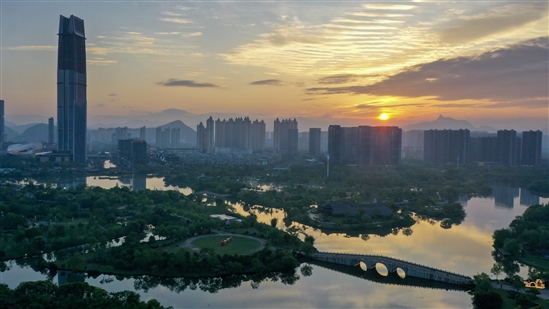 4月23日傍晚,经过一场甘霖涤荡后,市区九龙汇公园之上,天际绽开绮丽云霞。霞光似熔金倾泻,与澄澈湖波、蜿蜒石桥、苍翠林荫、摩天楼影、绵延山峦层层晕染,织就一幅动静相宜的天然画卷,令人心旷神怡。记者 周学军 摄