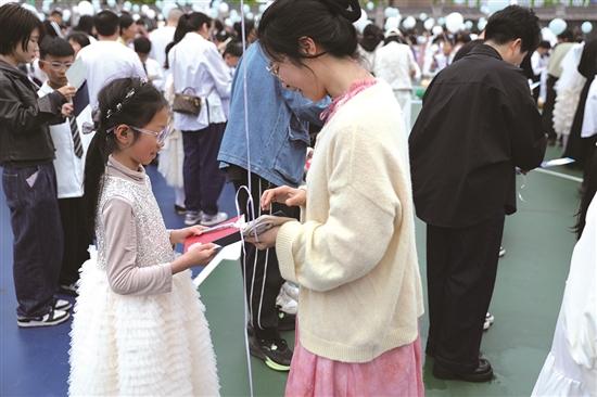 本报讯(记者郑菁瑶 通讯员莫灵江)“当我写信的时候,就会回想起妈妈对我的关心与照顾,心里非常感激。”四(8)班学生陈昱汝告诉记者。4月25日下午,新河小学的操场被气球与欢声笑语填满,700多名四年级师生、家长齐聚一堂,参与“‘拾’光欢喜 逐梦未来”十岁成长礼暨家长开放日活动。通过书信传情、亲子互动、集体团建、学生观影等环节,老师和家长共同见证孩子们从稚嫩童年迈向责任少年的重要一步。