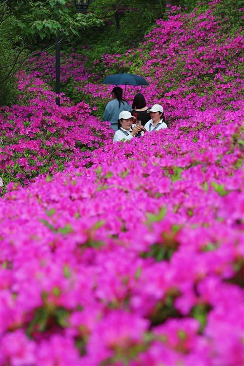 谷雨时节,植物园内,杜鹃花竞相绽放,漫山遍野,呈现出一幅绚烂夺目的自然画卷,引得赏花打卡的游人纷至沓来。