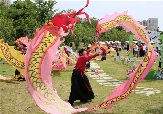 近日,新河镇河滨公园内锣鼓喧天,热闹非凡,当地群众以舞龙、歌舞、非遗体验、越剧表演等多种形式,庆祝“五一”国际劳动节的到来。