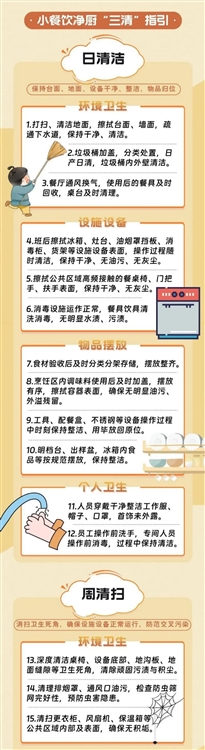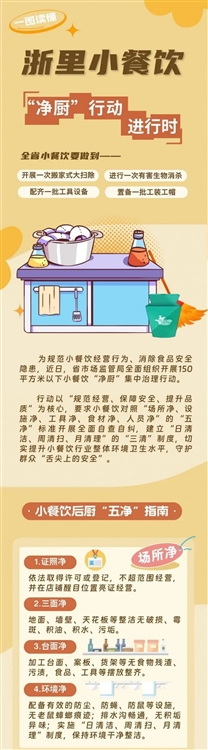 行动以“规范经营、保障安全、提升品质”为核心,按照后厨“五净”(场所净、设施净、工具净、食材净、人员净)指南、“三清”(日清洁、周清扫、月清理)指引要求开展,通过依法查处一批案件、曝光一批案例、提升一批重点单位,重点解决小餐饮后厨环境卫生差、加工操作不规范、食品安全隐患突出等问题,实现小餐饮行业整体环境显著改善,群众满意度持续提升,形成小餐饮治理长效机制。(来源:浙江发布)