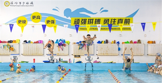 在训练基地里,学生们正在进行腰腹力量热身训练。左转便是泳池——一个仅25米长、有4条泳道的小型泳池。“场地有限,队员们只能分批次下水训练。”潘雷告诉记者,36名队员按照年龄分为3个批次训练,每天一到两小时“轮班”下水。尽管硬件条件有限,但这支队伍并没有气馁。