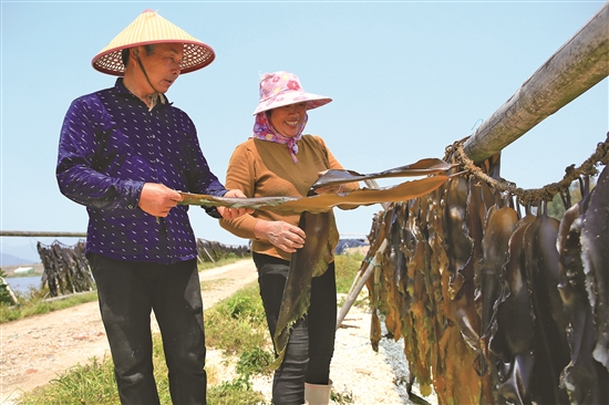 近来,坞根镇东门头村浅海养殖区迎来海带丰收季,村民们忙着采收、晾晒、加工,呈现出一派繁忙的丰收景象。当地利用得天独厚的浅海资源优势,大力发展紫菜、海带等水产养殖业,不仅带动了村民增收,也为乡村振兴注入了新活力。