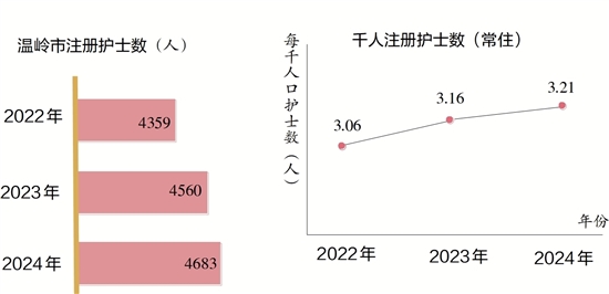 温岭市注册护士数从2022年的4359人增至2024年的4683人,年均增长3.6%。至2024年,我市每千人口注册护士数为3.21人,较2022年的3.06人稳步提升。