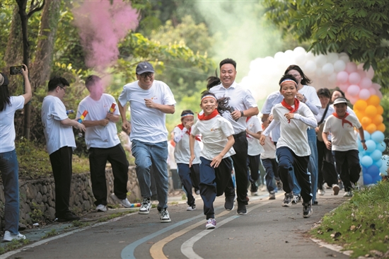 5月13日,五龙山绿道上跃动着绚丽的“彩虹”,锦园小学四年级学生与家长身着定制活动T恤,携手奔跑。这场以“拾阶而上 潮FUN彩虹跑”为主题的十岁成长礼活动,坚持党建引领,由学校党总支书记带队领跑,深度融合运动挑战、感恩教育与家校共育,为孩子们的十岁新起点镌刻下独特的印记。记者 郑菁瑶