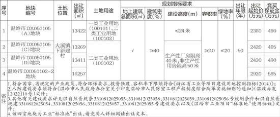 根据国家有关法律、法规规定,依据温自然资规条3310812025055、3310812025058、3310812025059、3310812025056号规划条件和温自然资规建3310812025054、3310812025056、3310812025057、3310812025055号建设要求,经温岭市人民政府批准,温岭市自然资源和规划局决定以挂牌方式出让温岭市DX050105(A)地块(不动产单元编号为331081101021GB00698W00000000)、温岭市DX050105(C)地块(不动产单元编号为331081101021GB00685W00000000)、温岭市DX050105(D)地块(不动产单元编号为331081101021GB00686W00000000)、温岭市DX050102-2地块(不动产单元编号为331081101021GB00697W00000000)等四宗工业用地“标准地”国有建设用地使用权,现将有关事项公告如下: