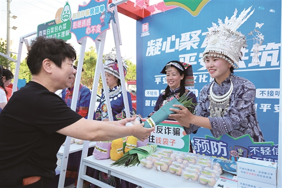 为了吸引更多居民参与,活动特别准备了印有趣味反诈宣传标语的蔬菜和鸡蛋作为小礼品,将反诈元素巧妙融入日常生活用品。“网络理财,鸡飞蛋打”“青菜白菜包心菜,叫我转钱不理睬”……这些特殊的“礼物”大受欢迎。居民方大妈笑着说,民族服饰很漂亮,反诈标语也很好记,这样的宣传方式让大家既学习了反诈知识,增加了反诈参与度,也得了实惠,有趣又接地气。