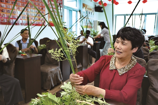 端午节临近,太平街道方城社区居民正在用菖蒲、艾草等传统材料制作艾草花束门挂。菖蒲挺拔修长,艾草清香四溢,搭配各种装饰物,在居民们的巧手下变成一件件精美的艺术品。