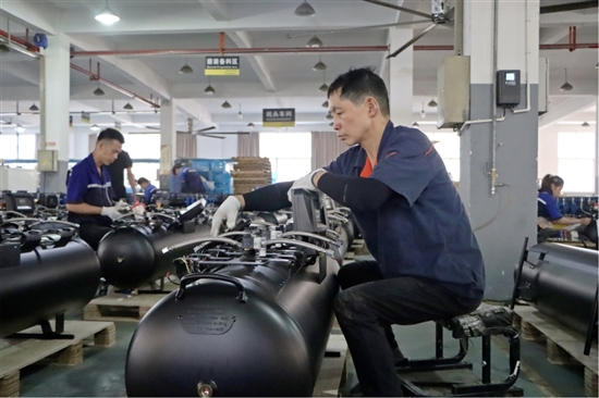 本报讯(记者贾宁欣/文 通讯员江文辉/图)近日,在位于箬横镇的浙江奥利达气动工具股份有限公司生产车间里,工人们正在加紧赶制一批无油空压机,这些产品即将发往中东欧市场。