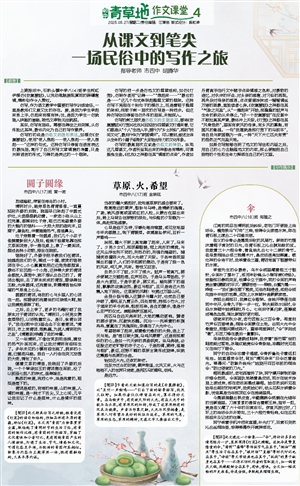 【简评】此文颇具仿写之神韵,粗看没有《灯笼》的语句和结构,但细品却有丰厚的意蕴,神似《灯笼》。本文用“青团”为物象贯穿全篇,联结起了清明时节的生活习俗,有青团的制作过程,有青团的外形描写,穿插了文化意味和今昔对比,更有围绕青团产生的人情滋味,打通了生活、节气、情感和文化,可谓包容且丰满,与饱满的青团何其相似。物象与内容与主题浑然一体,既有圆融结构,又具丰厚内涵。
