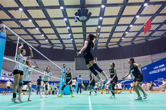 近日,2025年浙江省气排球公开赛(温岭赛区)在温岭市体育馆举行,来自浙江各地区的38支队伍、300多名运动员相聚于此,以球会友,切磋球技。图为来自绍兴市星火建材代表队的参赛选手上演了一记精彩扣杀。