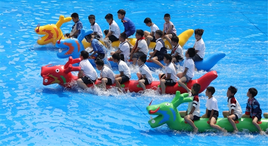 值得一提的是,现场还组织了“水上龙舟”趣味赛。孩子们按照班级分组,奋力划动充气小龙舟,水花伴着加油声飞溅,他们在汗水与欢笑中感受团结协作的力量。“没想到在学校也能划龙舟,第一次划龙舟还拿到了第一,这让我体会到团结的重要性。”四(5)班学生李睿章表示,很惊喜能够在节日到来之前和小伙伴们一起体验划龙舟。与此同时,另一边的孩子们正在进行“旱地龙舟”挑战,小小的龙舟承载着节日的快乐。