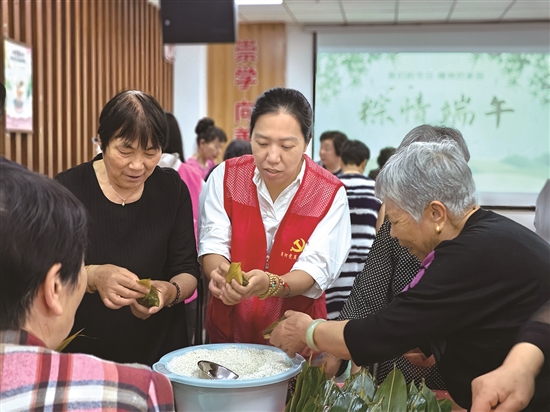 太平街道月河社区开展邻居节活动,传承包粽子技艺,有经验的阿姨们手把手教年轻人包粽子,现场欢声笑语不断。