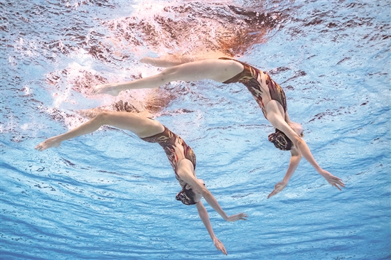 2024年8月10日,中国组合王柳懿/王芊懿在巴黎奥运会花样游泳双人自由自选比赛中。