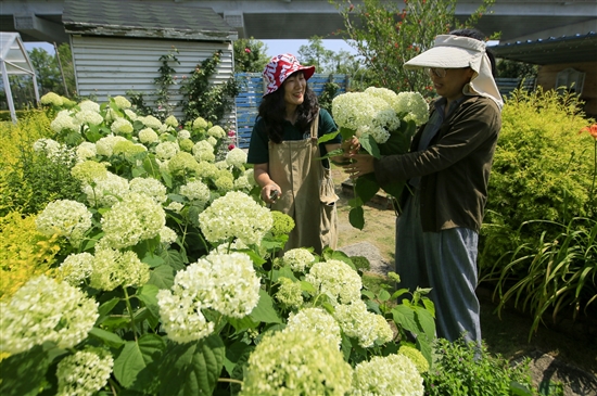 在箬横镇前九份村,肢残青年王媛萍2019年创办了雯心园艺场,通过吸纳残疾人就业、开展技能培训,积极带动身边的残疾人共同致富,同时为当地美丽乡村建设注入了新的活力。王媛萍因此当选为温岭市人大代表,还荣获“浙江省残疾人创业之星”称号。图为6月4日,王媛萍(左)正在采摘客户预订的鲜花。