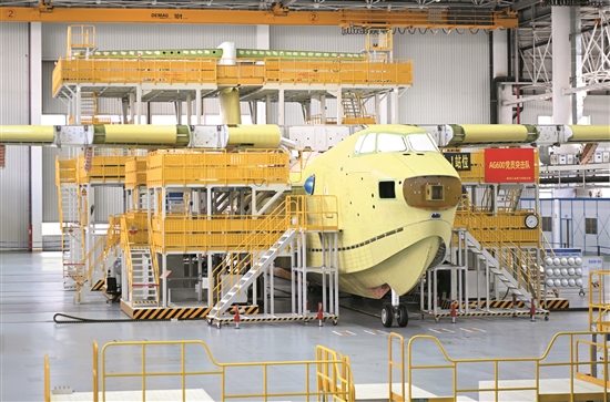 6月11日,我国完全自主研制的大型水陆两栖飞机AG600“鲲龙”在广东珠海获颁中国民航局生产许可证,标志着AG600飞机正式迈入批量生产阶段。AG600飞机的成功研制,表明我国在大型特种飞机设计制造协同、供应链管理、工艺一致性控制等领域形成完整能力,为后续项目积累了可复制的管理经验与技术标准,实现了我国民机产业发展在大型特种用途飞机领域的历史性跨越。图为在珠海中航通飞华南飞机工业有限公司拍摄的AG600总装线。