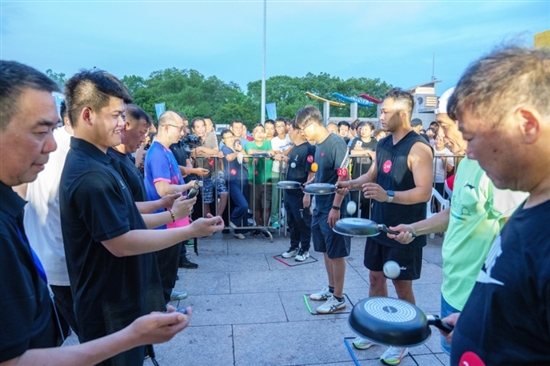 6月21日晚,浙江省第五届体育大会乒乓球比赛第二日,温岭市体育馆外广场上,“爱乒才会赢 温岭你最‘颠’”全民草根趣味乒乓球挑战赛点燃了现场市民的参与热情。一个个小小的乒乓球被温岭明星企业爱仕达生产的平底锅颠起,清脆的“咚咚”声此起彼伏,组成了一首全民运动狂欢曲。