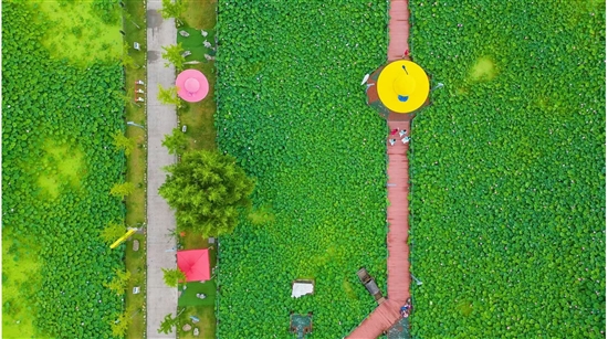 6月24日,泽国镇桥伍村荷花园荷花盛开,宛如水墨画卷,为夏日增添了一抹亮色,吸引不少游客前来观赏。
